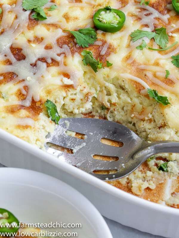 This Low Carb, Keto Jalapeño Corn Casserole is gluten free, grain free, moist, sweet and fluffy and filled with baby corn, juicy summer squash, fresh jalapeños and creamy cheese. | www.farmstmeadchic.com | #keto #lowcarb #glutenfree #grainfree #lowcarbcorncasserole #jalapenocorncasserole #farmsteadchic