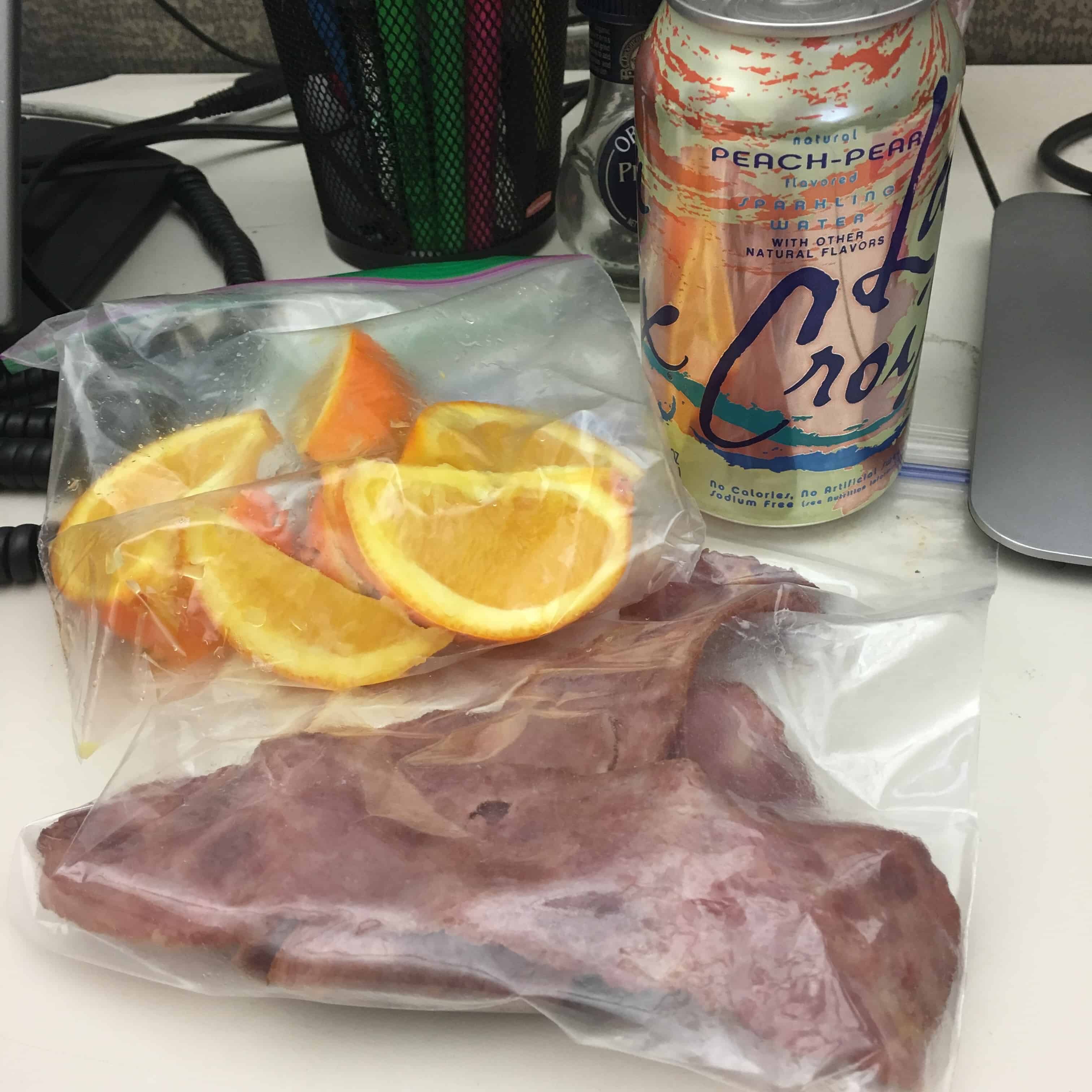 Day 5 was a Friday and turned out to be completely crazy at work. I started the morning off with good intentions. I took to work with me some bacon, an orange and a Peach Pear La Croix. If you’re not familiar with La Croix, it’s a brand of sparkling water with no artificial or natural sweeteners of any kind.