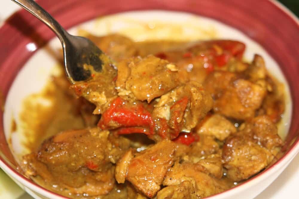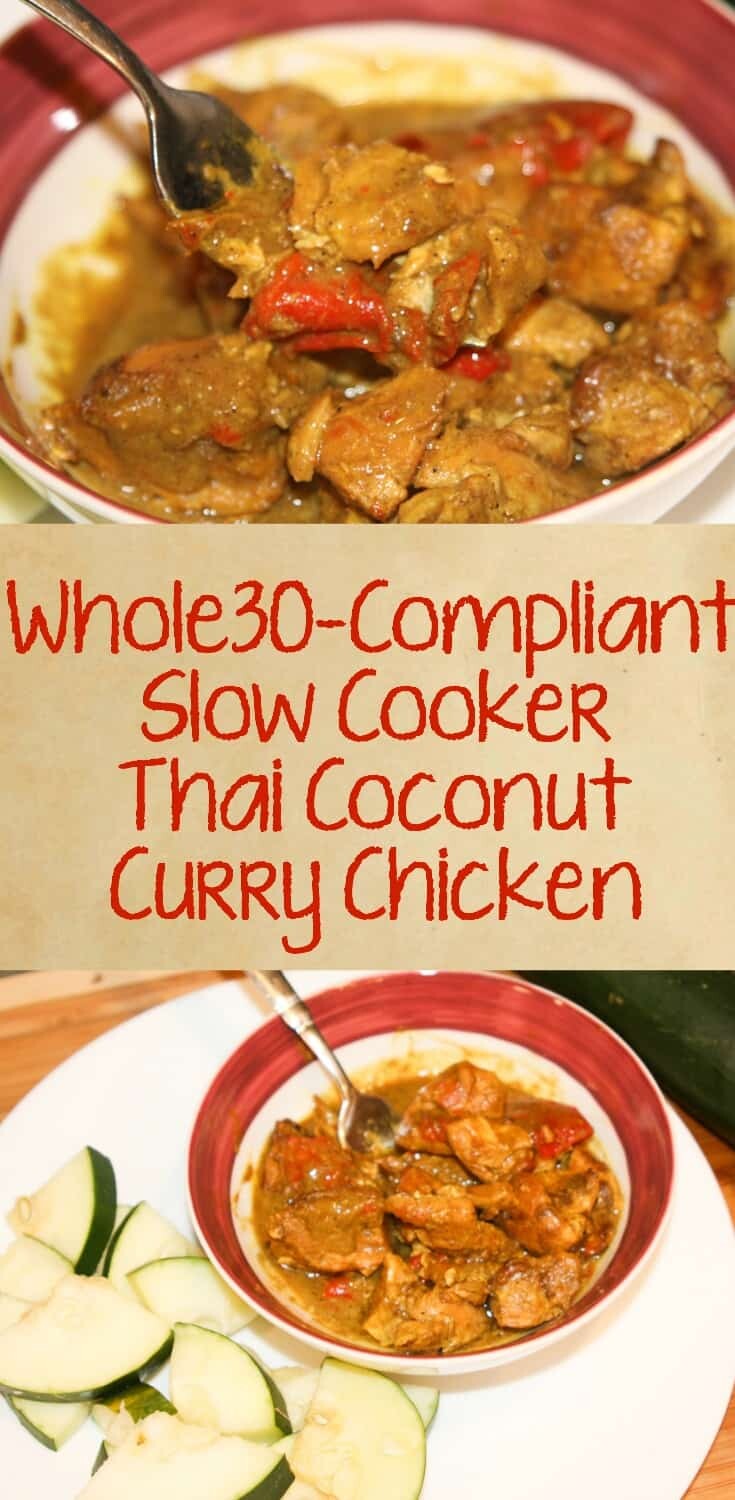 After I scrounged up breakfast, I started preparing our lunch. Unfortunately, I haven’t been able to find many Thai-inspiried Whole30 recipes, so I set out to come up with my own. I browned a pound of chicken breasts, cubed, in coconut oil and placed it in the slow cooker. With it, I added a can of coconut milk, one sweet red bell pepper, seeded and sliced, 3 tablespoons of yellow curry powder, 1 teaspoon of cumin, and 1/2 teaspoon of cayenne pepper. I set it on high for six hours. When I came home for lunch, it smelled amazing! However, the next time I make it, I will add a cup of Whole30-compliant chicken broth to make it a little more soupy.